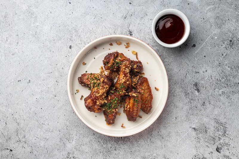 Куриные крылья в соусе BBQ, лук фри, лук шнит