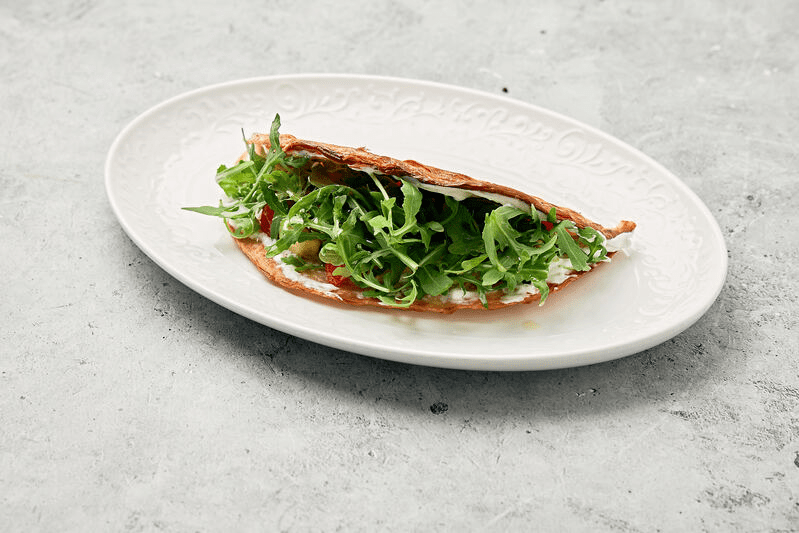 Поджаренная слоеная лепешка смазанная кремом из брынзы, фаршируется рукколой, обжаренными креветками, томатами черри и авокадо